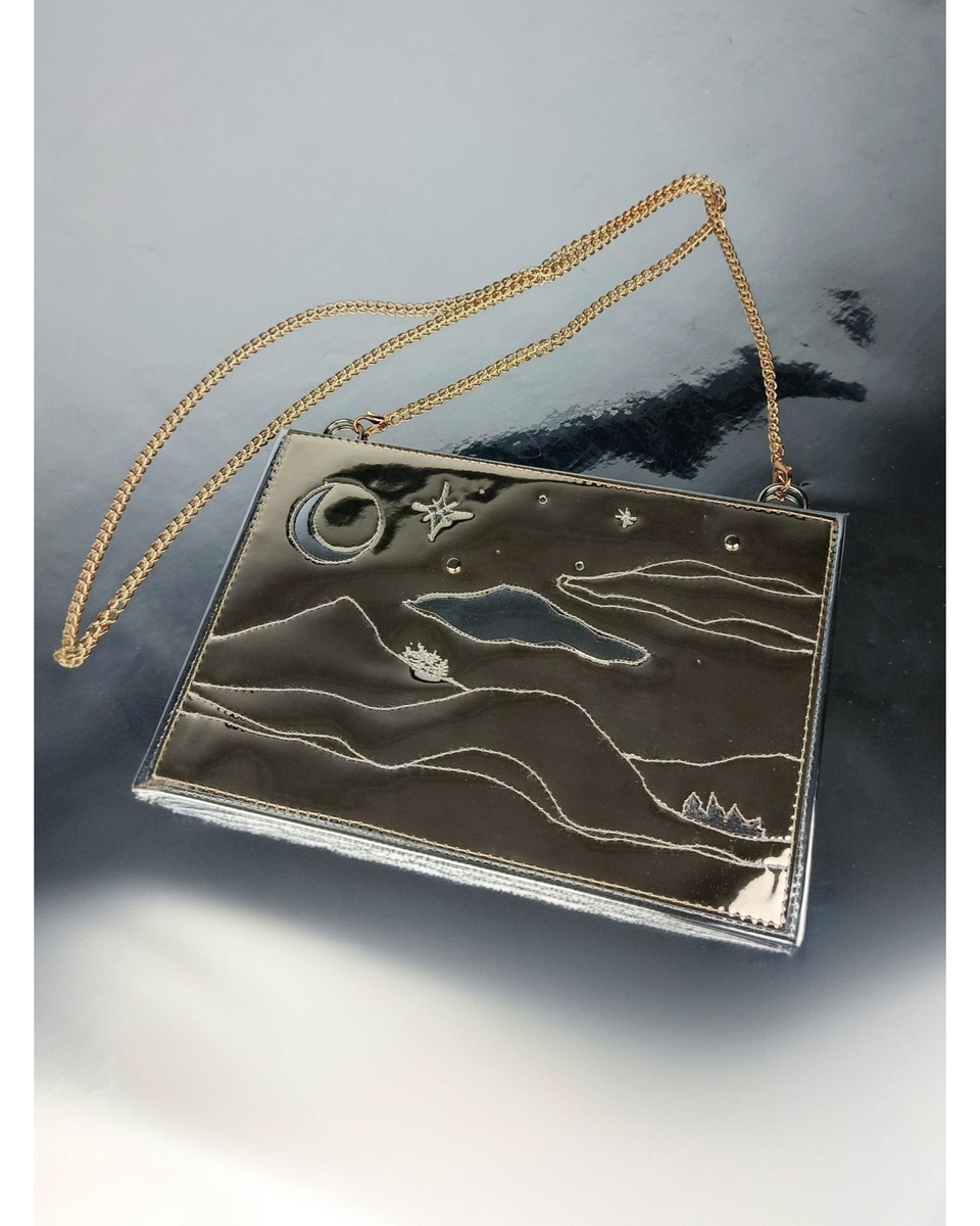 A mostani, ünnepi kollekció egyik ikonikus darabja egy téli éjszakát idéz: csillogó fekete bőrfelületen hegyek, hold, csillagok és egy apró hajó jelenik meg, finoman hímzett vonalakkal.