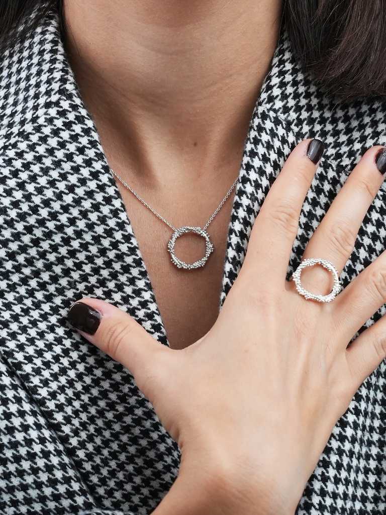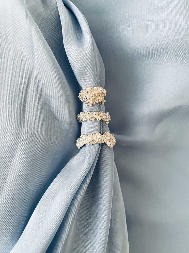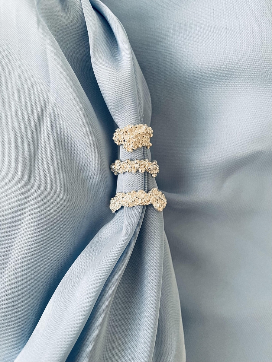 A Verena kollekcióban található gyűrűk, fülbevalók és nyakláncok különleges textúrájukkal és organikus formáikkal tűnnek ki. Egy francia kávézó reggeli fényei között ugyanúgy megállják a helyüket, mint egy New York-i esti filmbemutató reflektorfényében – éppúgy illenek hétköznapi viselethez, mint ünnepi megjelenéshez.